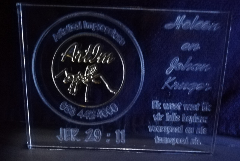 Enige grootte Perspex met logo en woorde gegraveer.